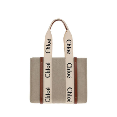 Canvas Woody Shoulder Bag by Chloé, two flat top handles, removable and adjustable flat leather shoulder strap, bands on front and back with contrasting iconic brand monogram, interior flat pocket, leather trim.