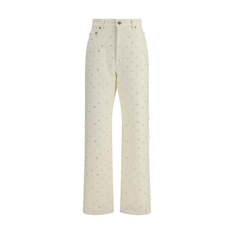 Die weiße Denimhose von Golden Goose mit Perlen- und Kristallstickerei versprüht den lässigen Glamour der 70er-Jahre – einer Ära, in der die Nacht zum Schauplatz für Selbstverwirklichung wurde. Die Hose aus robustem Bull-Denim mit Used-Look ist mit Perlen und Kristallen verziert und sorgt so für einen strahlenden, ausdrucksstarken Look. Zwei Gesäßtaschen, die klassische Fünf-Taschen-Konstruktion und die markentypischen silbernen Sterne auf der Rückseite runden das Design ab. Ein Retro-Piece mit dem modernen Golden-Goose-Flair.