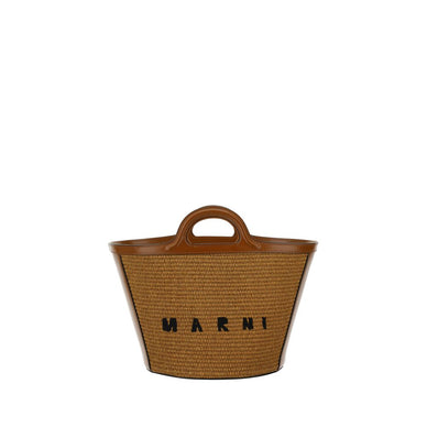 Tropicalia Bucket Bag von Marni, durchgehend aus Bast gefertigt, mit kontrastierenden Lederbesätzen und -details, zwei runden und festen Ledergriffen, verstellbarem flachen Schulterriemen, innenliegendem Kordelzugverschluss, passendem Stofffutter, ikonischem Markenmonogramm in Kontrastfarbe auf der Vorderseite, Innentasche mit Reißverschluss.