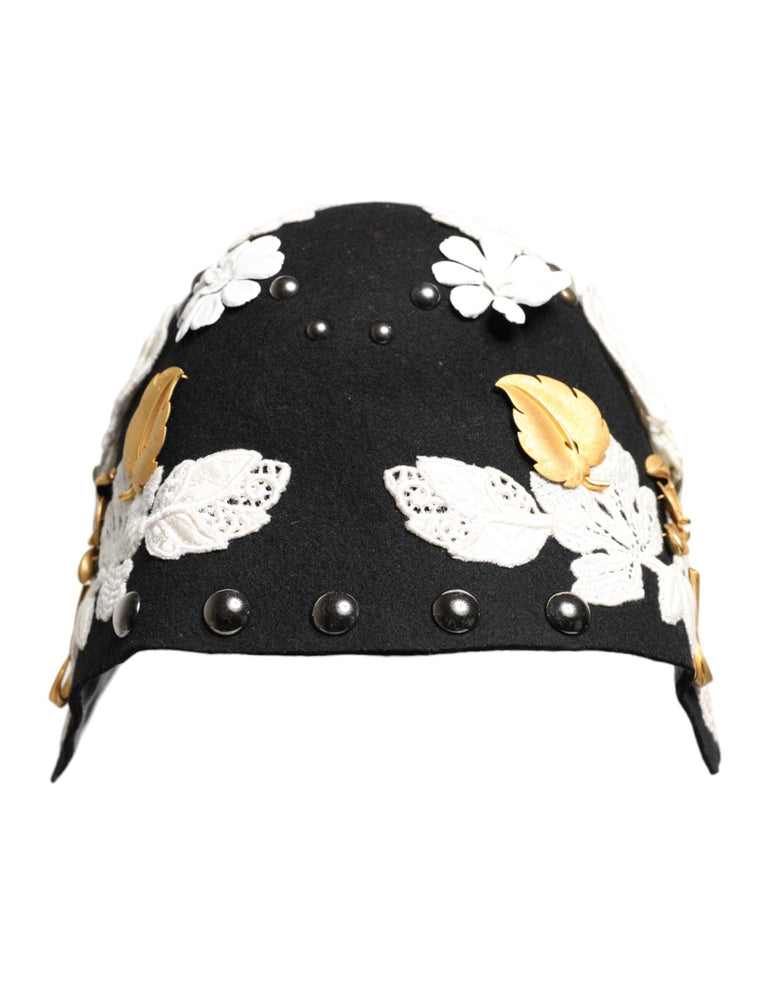 Dolce & Gabbana Black Wool White Floral Gold Leaf Cloche Hat Dolce & Gabbana