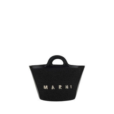 Sac seau Tropicalia de Marni, entièrement en raphia, finitions et détails en cuir contrastant, double poignée supérieure ronde et fixe en cuir, bandoulière plate réglable, fermeture intérieure par cordon de serrage, doublure en tissu assorti, monogramme emblématique de la marque brodé en couleur contrastante sur le devant, poche intérieure zippée.