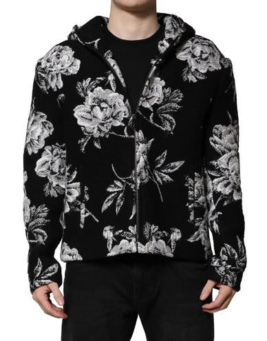 Dolce & Gabbana Black Wool Floral Printed Men Hooded Jacket