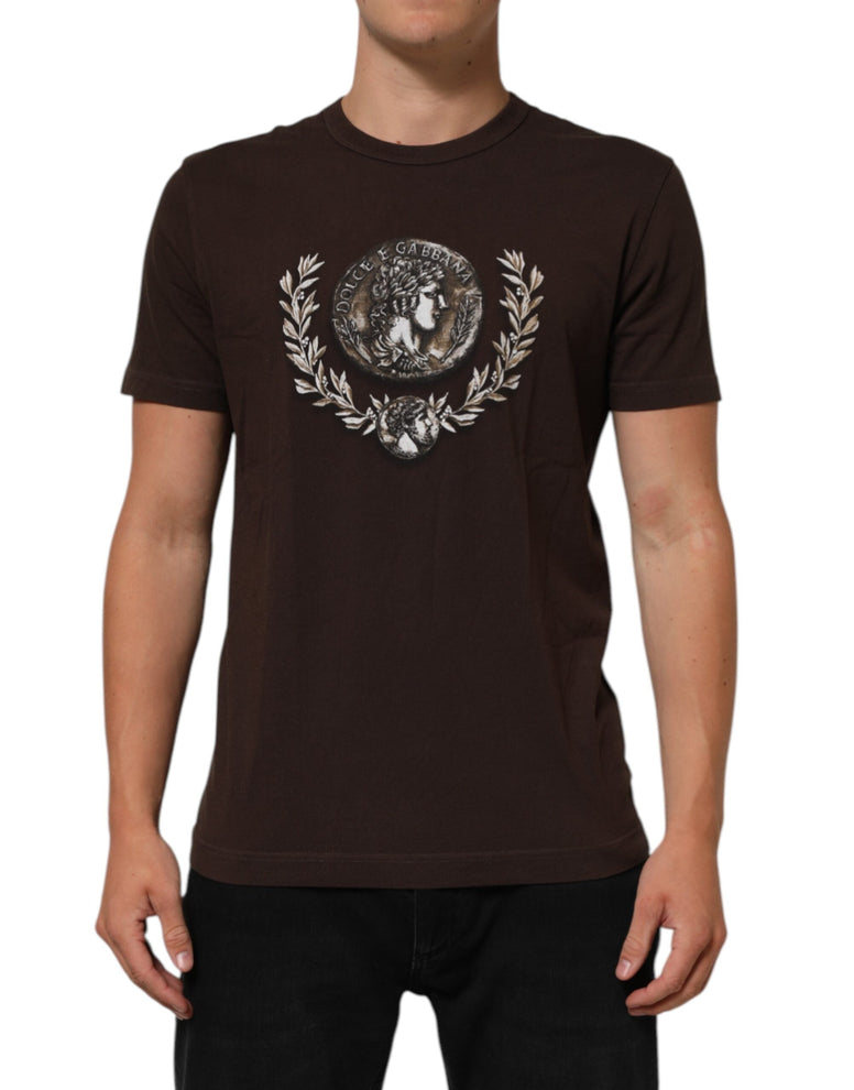 Magnifique t-shirt marron Dolce & Gabbana neuf et 100 % authentique, orné d'un imprimé raffiné de pièces de monnaie et de lauriers pour une allure classique et élégante. Confectionné en coton premium, ce modèle à col rond offre un confort optimal et un style sophistiqué, idéal pour des tenues décontractées chics.